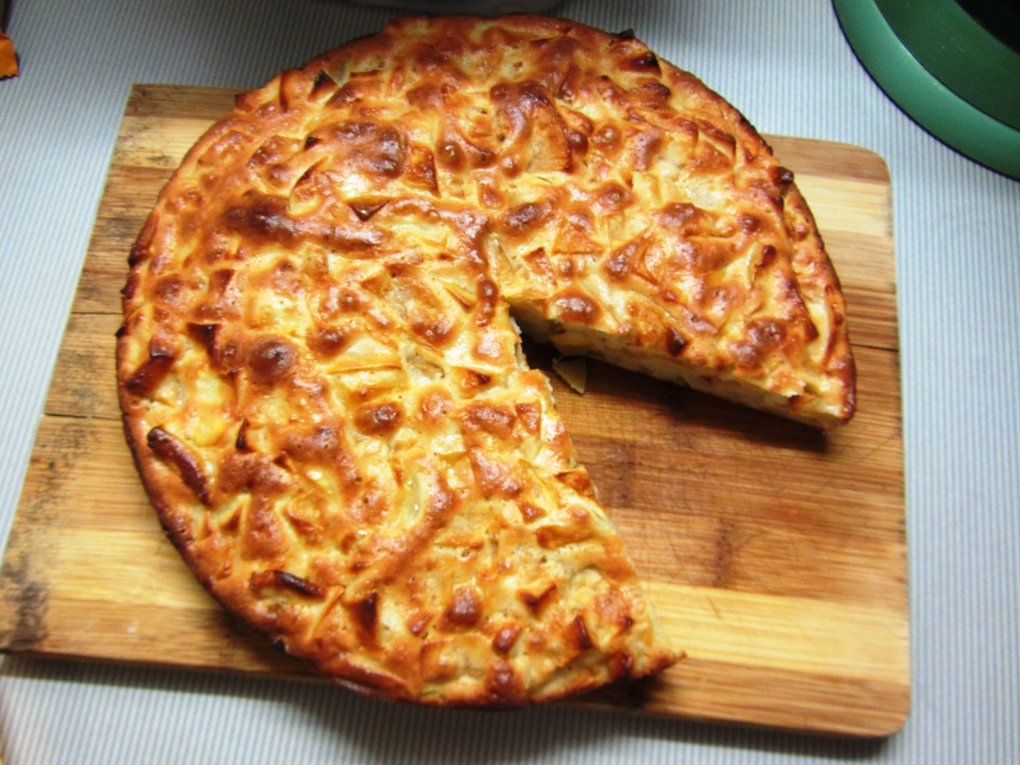 ШАГ 3 Форму смазать сливочным маслом, посыпать панировочными сухарями или измельченным печеньем, выложить яблоки и залить полученной массой.