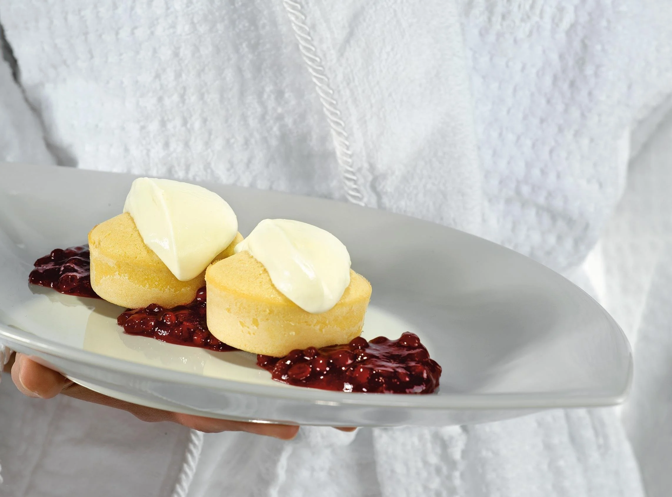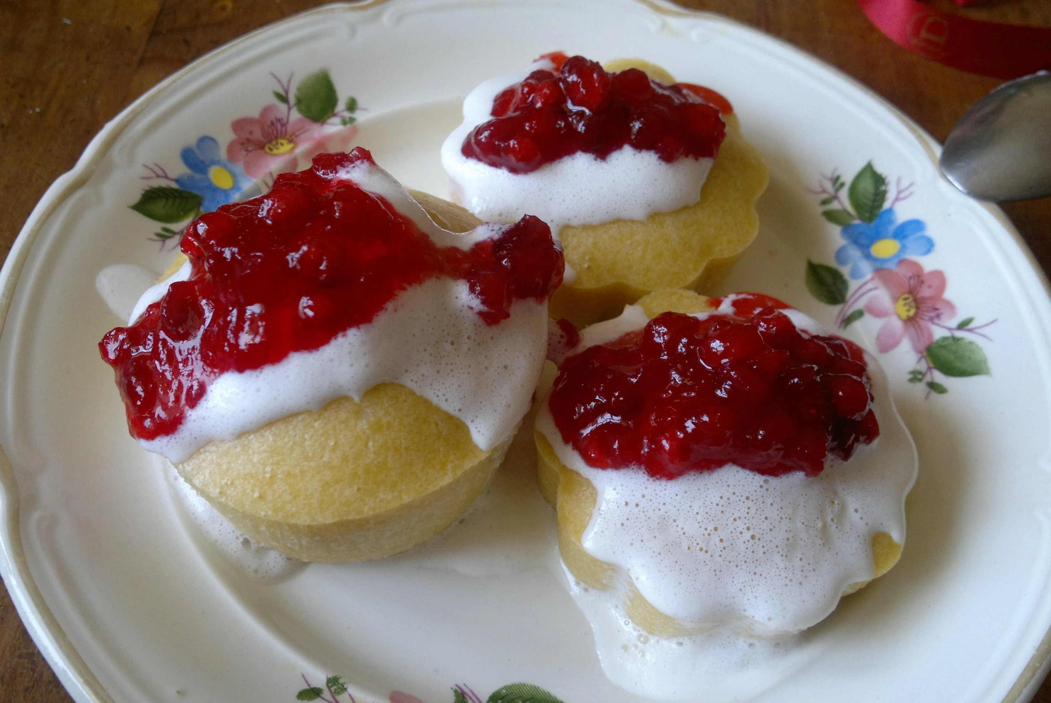 Подавать пивные оладьи с брусничным соусом и взбитыми сливками.