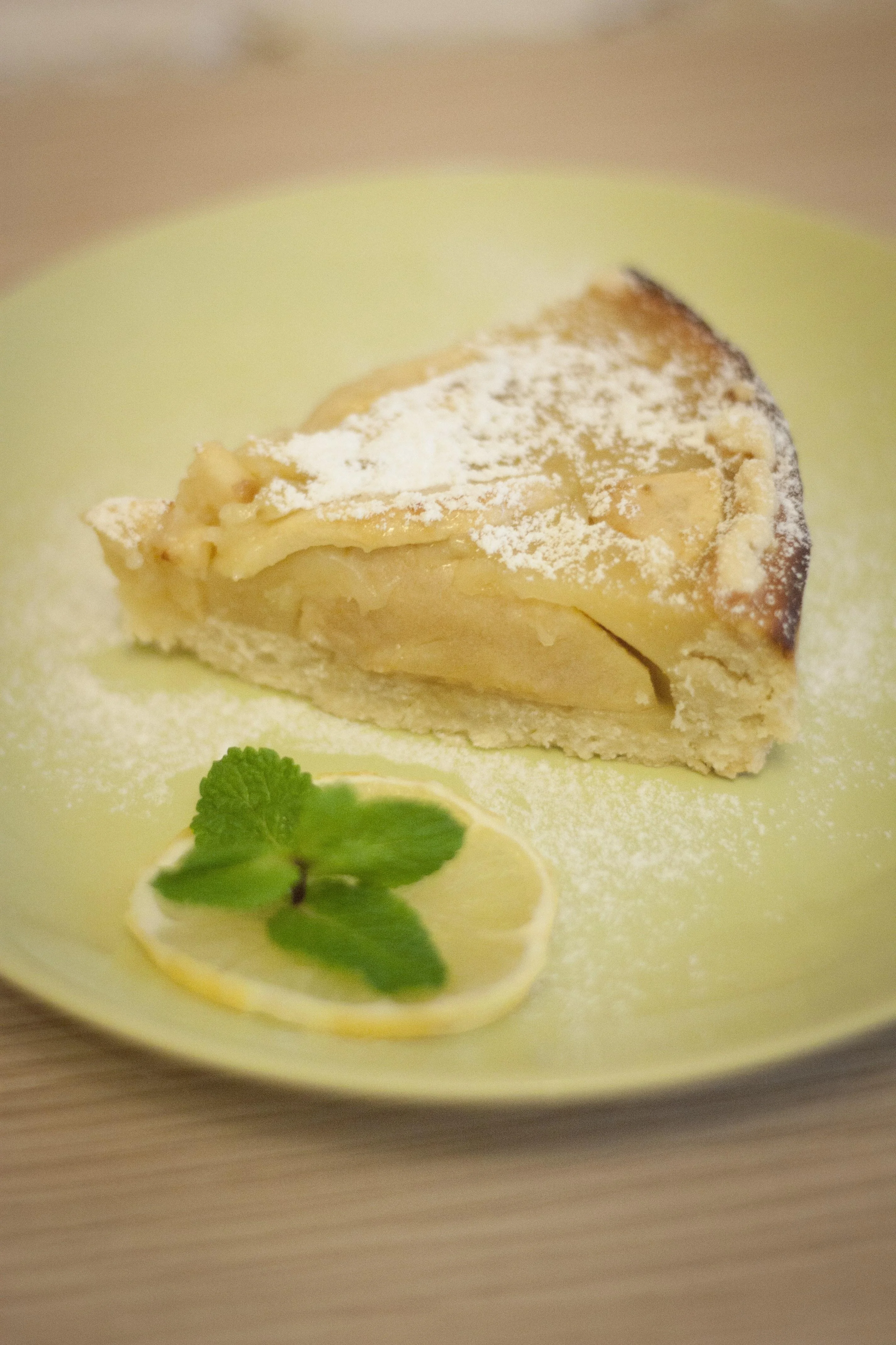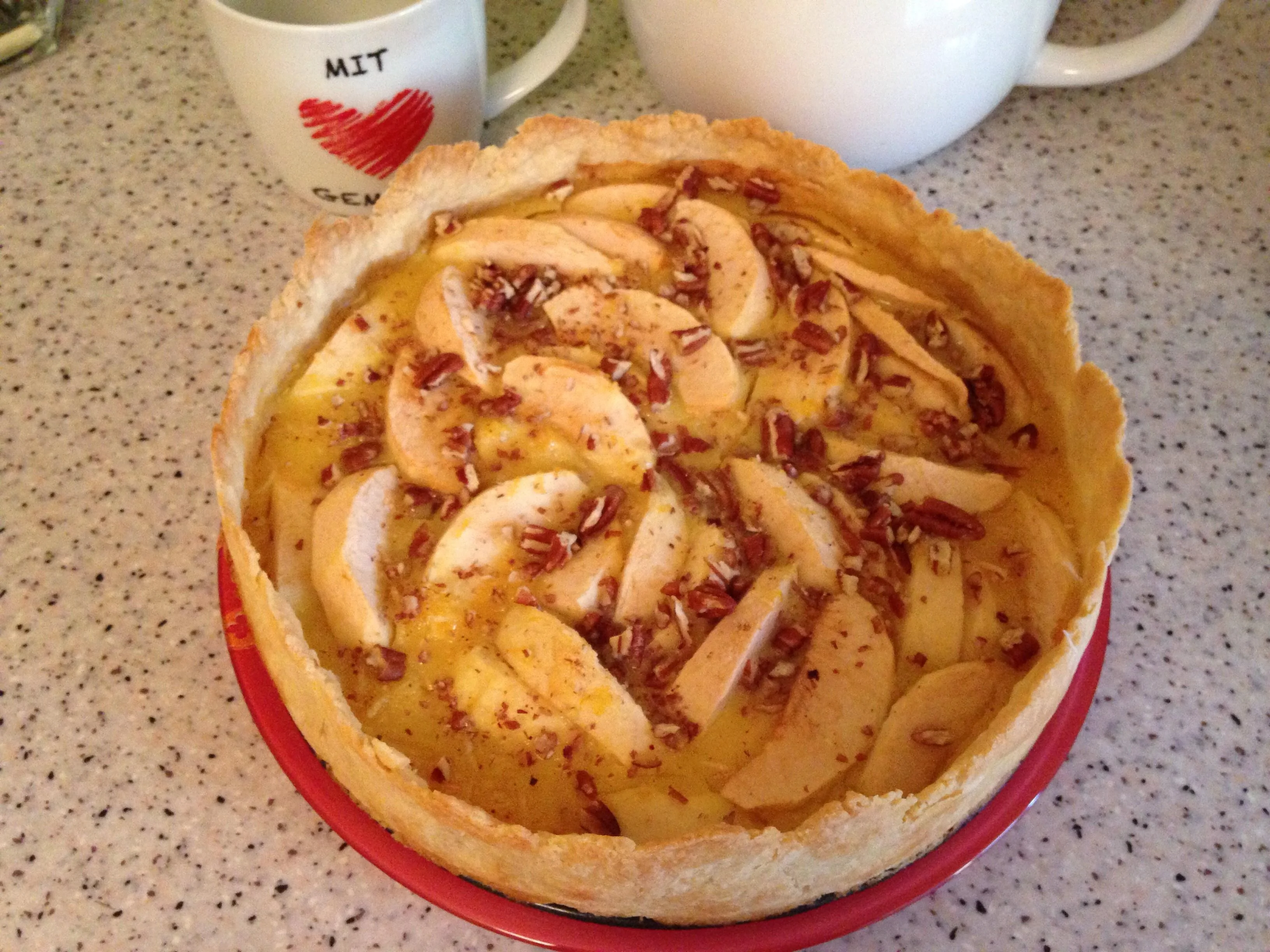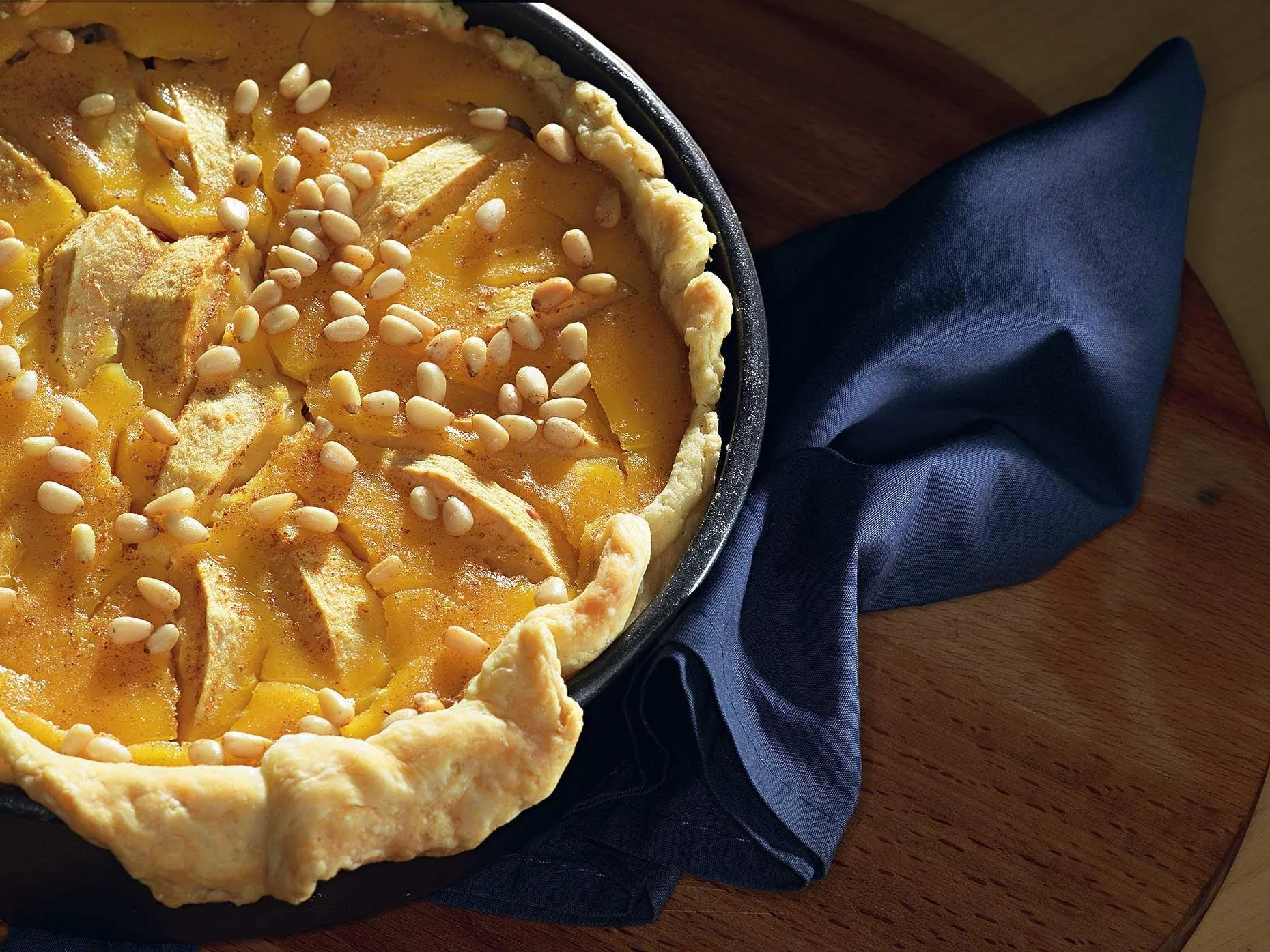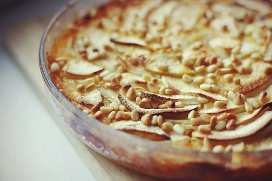 ШАГ 5 Через пятнадцать минут процедить лимонно-медовую заливку через сито, открыть духовку и, не вынимая форму, чтобы она не остыла, залить яблоки. Убавить жар до 160 градусов и закрыть духовку еще на тридцать минут. За десять минут до готовности посыпать кедровыми орешками.