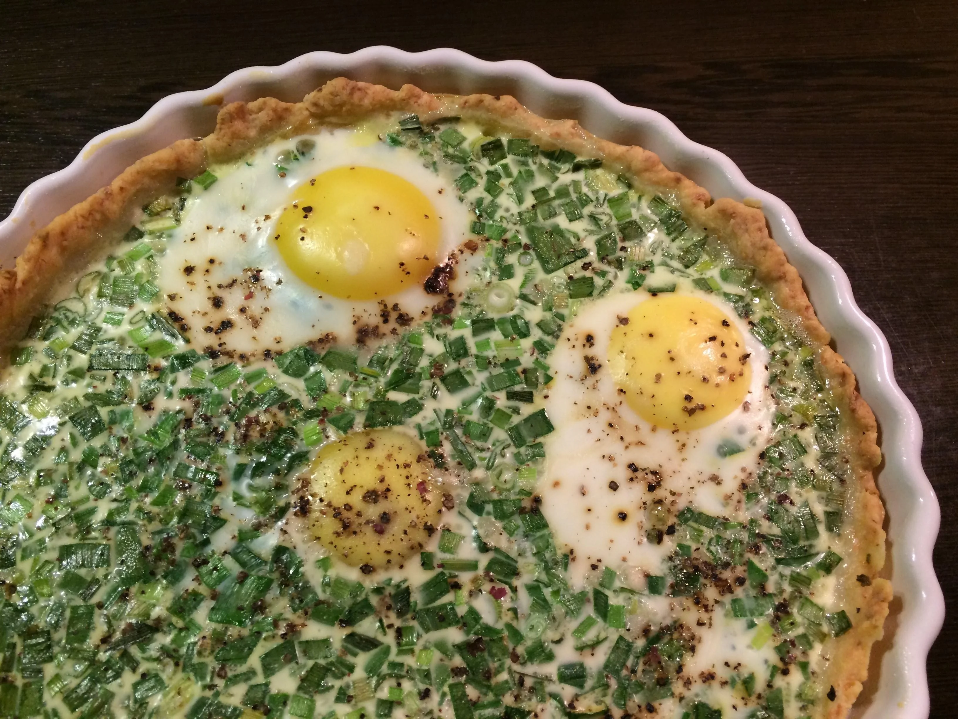 ШАГ 4 Зеленый лук нарезать мелкими кольцами. Разделить сливки пополам и одну половину смешать с луком. Выложить лук в сливках на запекшийся корж, сверху разбить прямо с целыми желтками четыре яйца. Оставшимися сливками равномерно залить всю поверхность пирога, в том числе и желтки.