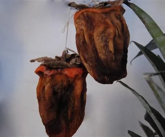 ШАГ 3 Туго привязать вокруг хвостика нитку. Связки не должны быть очень длинными. Через неделю на хурме появится легкий белый налет, не пугайтесь, это не плесень. Это выделяется глюкоза, которая покроет хурму.
