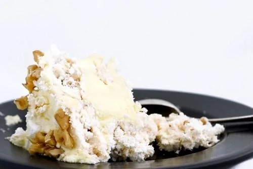 ШАГ 7 Коржи торта промазать кремом и соединить. На верхний корж выложить крем и украсить безе. Сверху можно посыпать толчеными грецкими орехами.