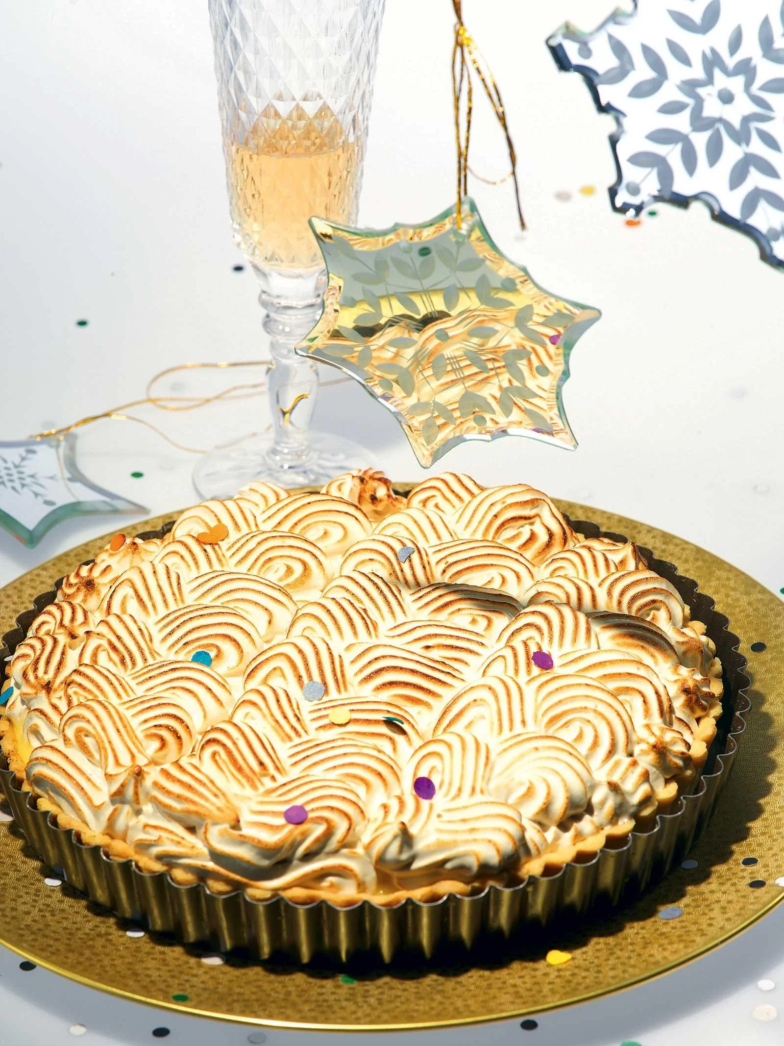 ШАГ 8 Взбить яичные белки. Влить в них сироп и продолжать взбивать, пока меренга не остынет. Украсить ею пирог и обдать огнем из горелки для придания нежно-коричневого цвета.