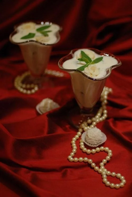 ШАГ 5 В креманку выложить готовый десерт, сверху украсить половинками «Рафаэлло» и веточкой мяты.