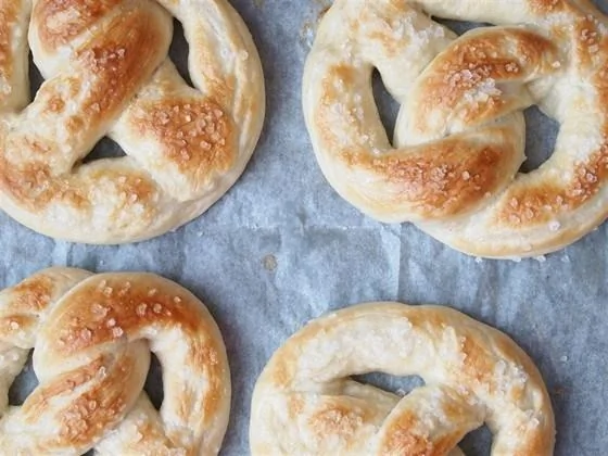 ШАГ 4 Вскипятить литр воды, добавить соду и 14 грамм соли, размешать. Сделать из каждого куска теста колбаску, взять один бок, примять его к центру, потом другой бок, тоже к центру, потом сложить колбаску пополам и снова смять. Раскатать длинную колбаску, сантиметров двадцать. Скрутить крендель. Повторить то же самое со всем тестом.