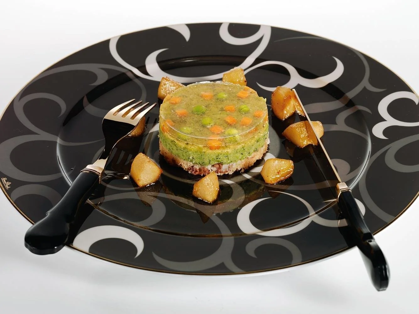 ШАГ 8 Достать подрумянившееся тесто, дать ему остыть. Надо обращаться с этим тестом очень аккуратно, потому что оно невероятно мягкое и хрупкое. Взять каждую лепешку, воткнуть в нее кольцо чуть меньшего диаметра, обрезав таким образом неровные концы. Сверху выложить столовую ложку пюре из горошка, аккуратно разровнять. Сверху положить несколько морковных кубиков и зеленых горошин. Залить до краев формы мятно-желатинную воду — аккуратно, чтобы она не замутилась. Поставить торты в холодильник на двадцать-тридцать минут.