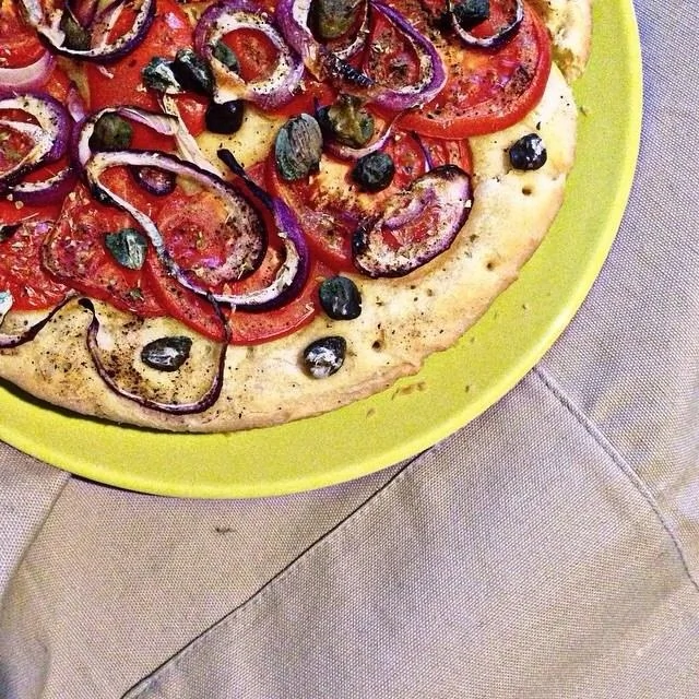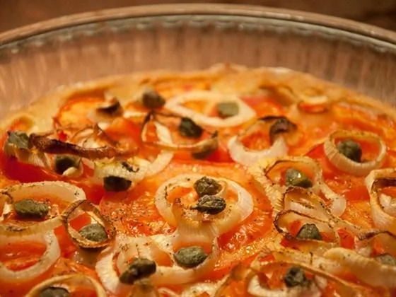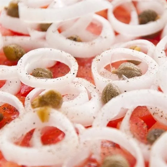 ШАГ 4 Лук и помидоры нарежьте тонкими кольцами. Выложите томаты на тесто, сверху положите луковые кольца и посыпьте каперсами. Поперчите по вкусу.