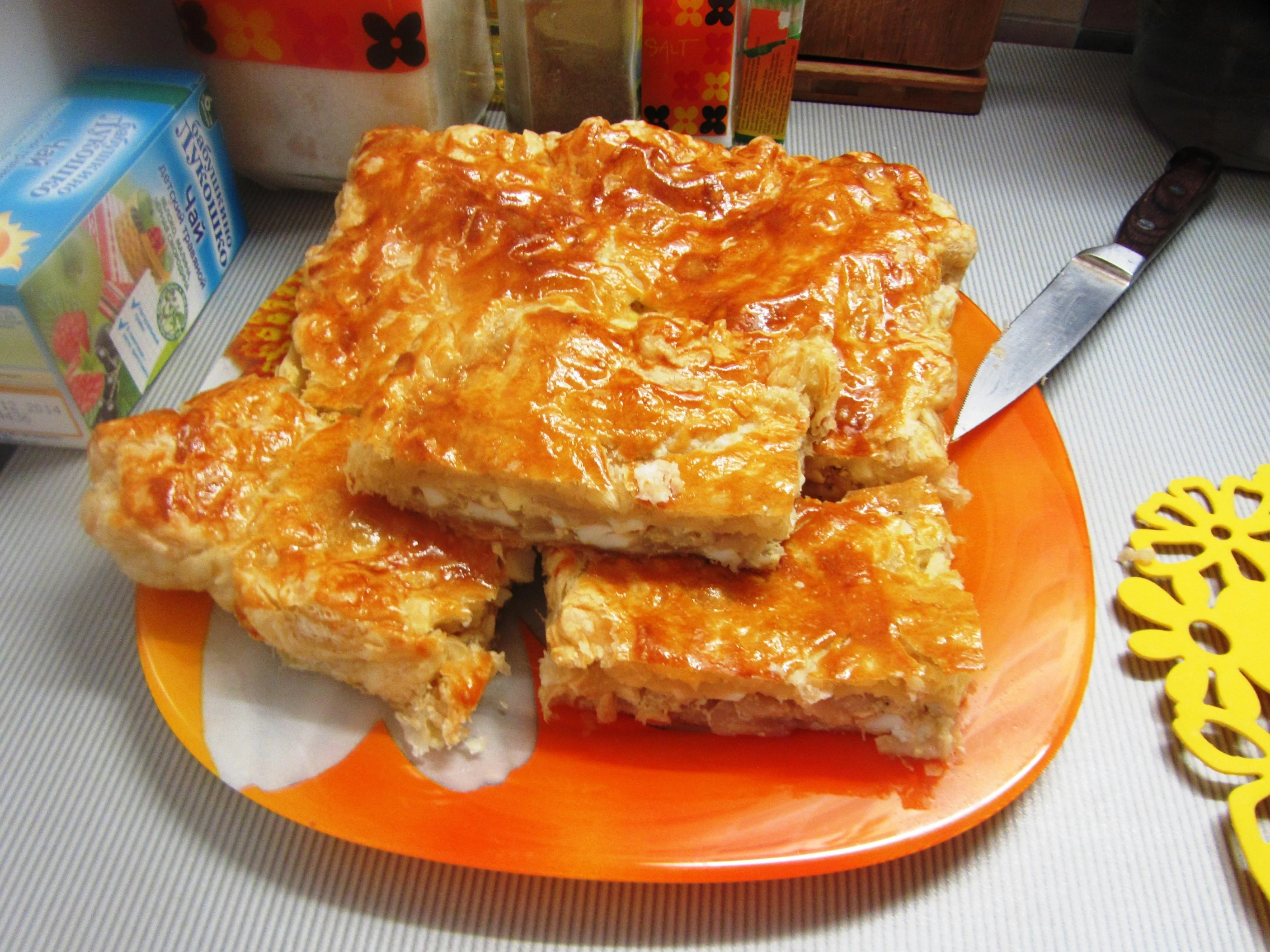 Пирог из слоеного теста с начинкой из капусты, зеленого лука и яйца