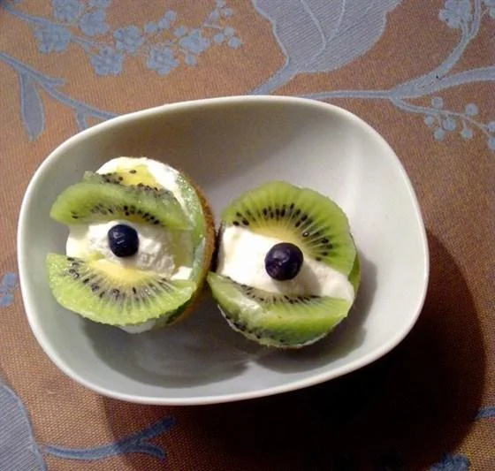 ШАГ 1 Разрезать киви на 2 половины, аккуратно вырезать дольки из каждой половинки.