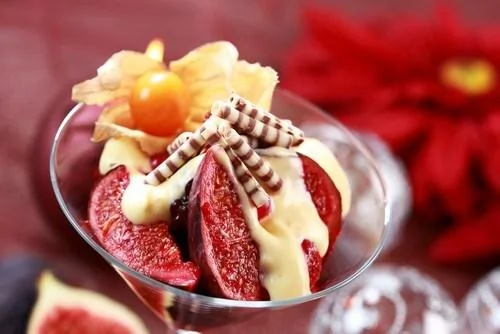 ШАГ 4 Разрежьте инжир на четвертинки, выложите на тарелки, добавьте малину и подавайте, полив кремом.