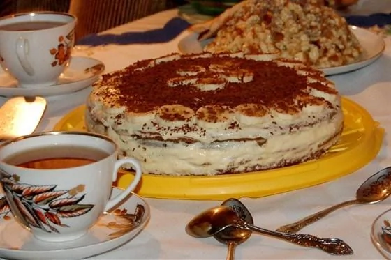 ШАГ 7 Каждый корж хорошо смазать кремом. Готовый торт лучше всего на ночь оставить — торт должен пропитаться. Затем его можно украсить фруктами, ягодами, орехами или тертым шоколадом.