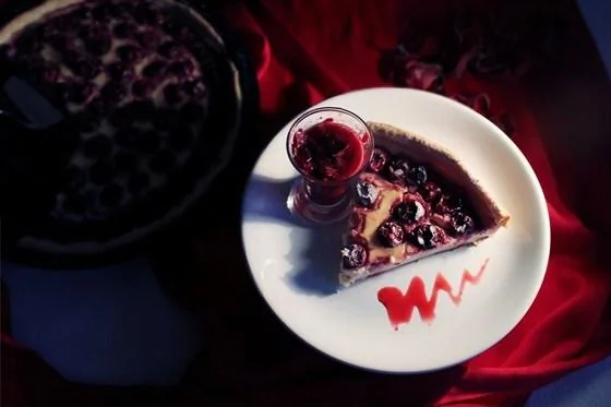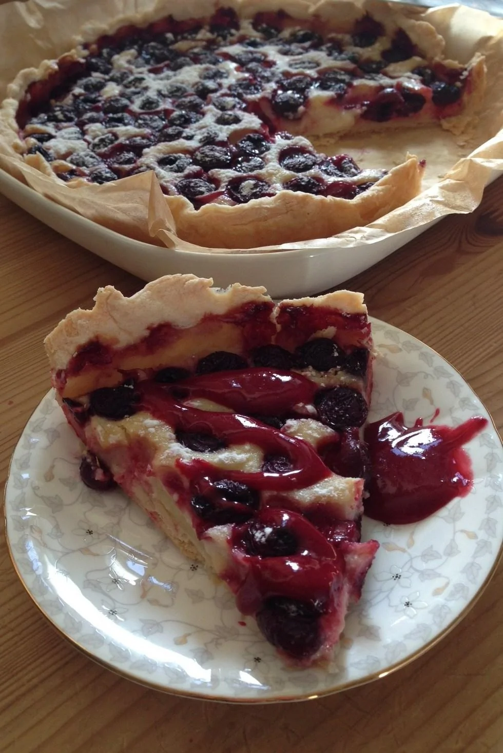 ШАГ 3 В форму влить заварной крем, и на него выложить 300 грамм вишни, едва придавливая ягоды: несмотря на то, что большая часть сока уже вышла, они по-прежнему могут окрасить весь крем в свой алый цвет.