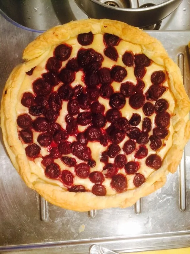 ШАГ 1 Вишню разморозить и оставить на 2 часа в сите, чтобы стек весь сок. Слоеное тесто раскатать в тонкий пласт на присыпанном мукой столе и выложить в форму для выпечки, смазанную сливочным маслом. И отставить на полчаса.