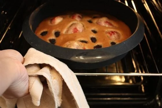 ШАГ 4 Аккуратно добавить в тесто клубнику и ежевику (половину). Разделить тесто по подготовленным формам и разровнять сверху лопаткой. Выпекать 30–35 минут. Охладить в форме в течение 5 минут, затем достать из формы, дать полностью остыть.