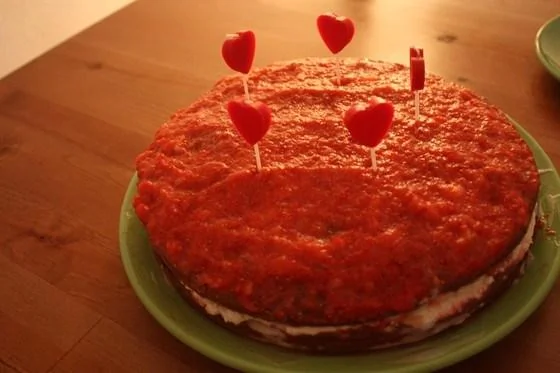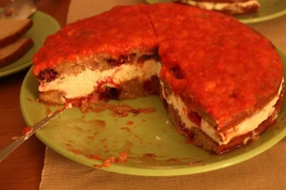 ШАГ 5 Положить один корж на блюдо. Выложить на него творог, смешанный с сиропами, разложить сверху 2/3 оставшихся ягод. Накрыть вторым коржом. Взять оставшуюся часть ягод (1/3), перемолоть в блендере и этой смесью покрыть верхний корж.