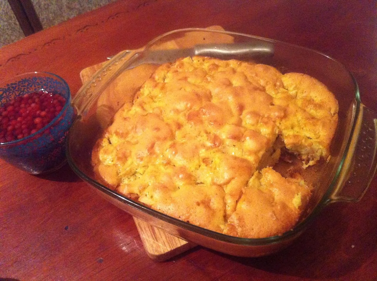 ШАГ 5 Залить смесь в форму поверх яблок и масла, дать постоять 15–20 минут и потом запекайте в разогретой духовке минут 20–30 до готовности при температуре 180 градусов.