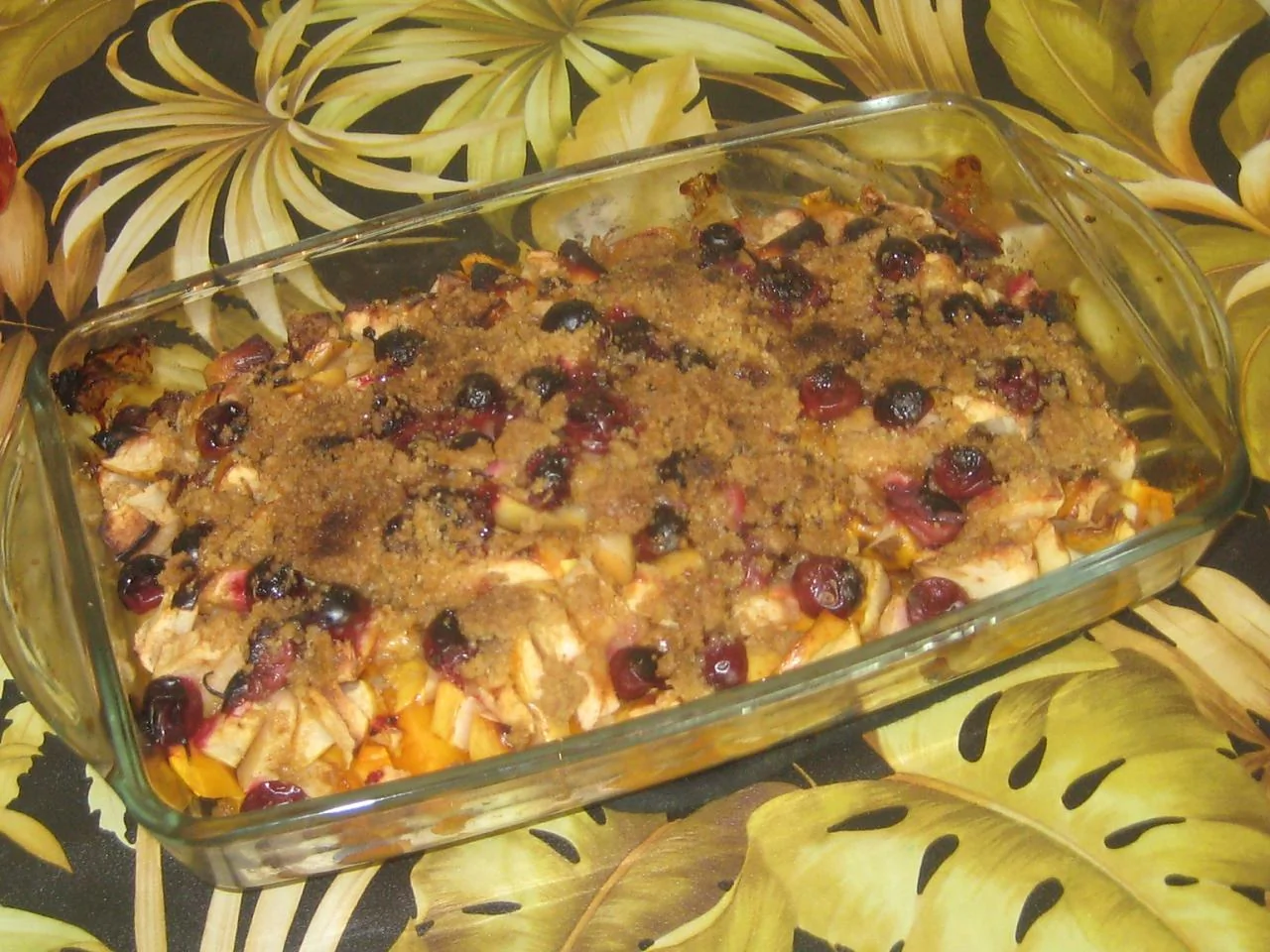 ШАГ 3 Выложите кусочки тыквы в смазанную маслом стеклянную форму ровным слоем. Сверху выложите яблоки и посыпьте клюквой.