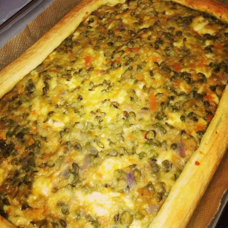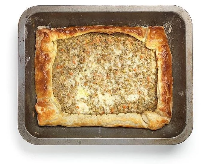 ШАГ 3 Слоеное тесто раскатать, смазав скалку мукой, в большой тонкий прямоугольник чуть больше стандартного противня. Выложить на тесто горох и завернуть края.