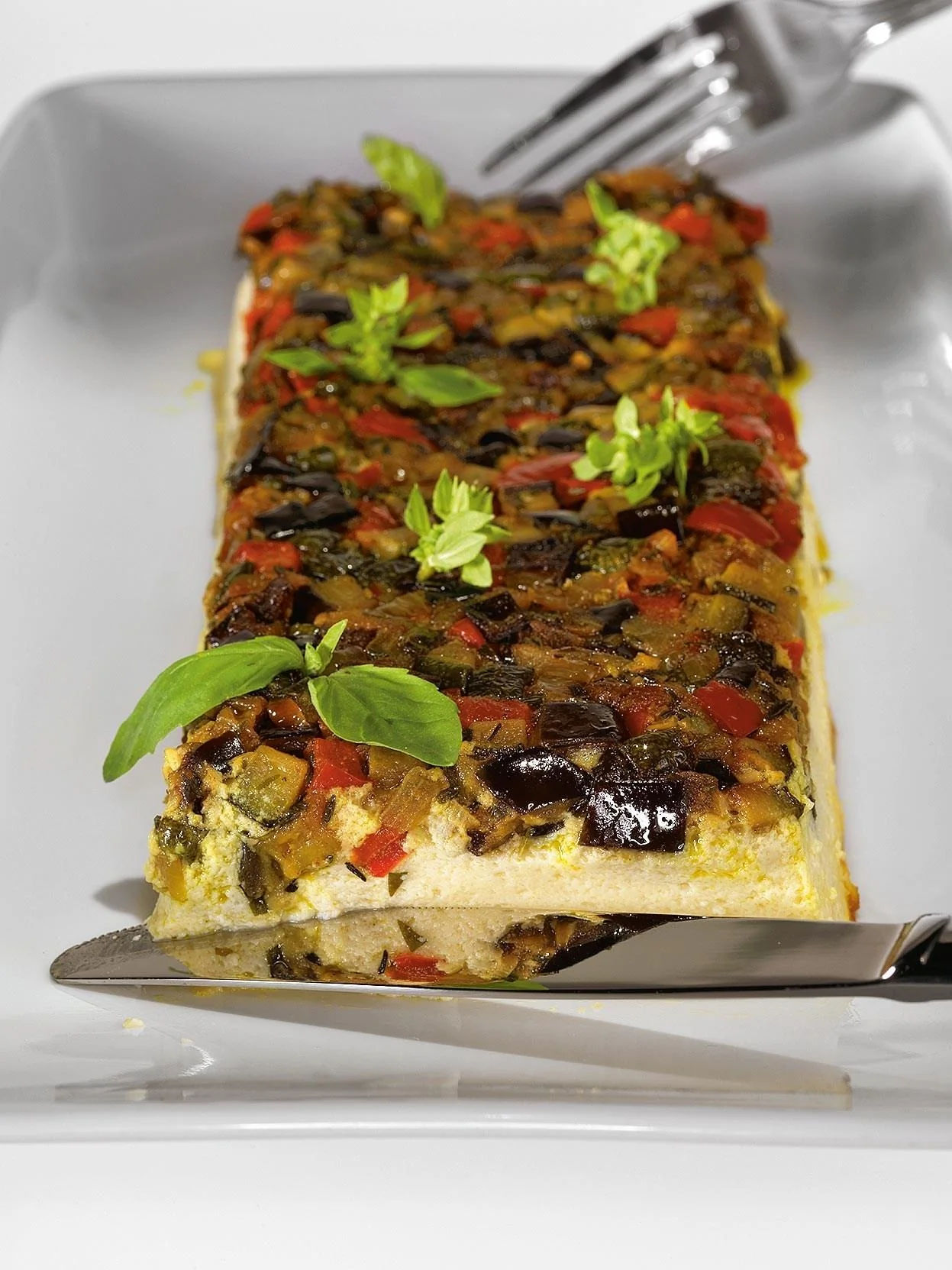 ШАГ 8 Уложить в форму ровным слоем рататуй, сверху аккуратно полить пюре из цветной капусты. Выпекать при 100 градусах сорок минут.