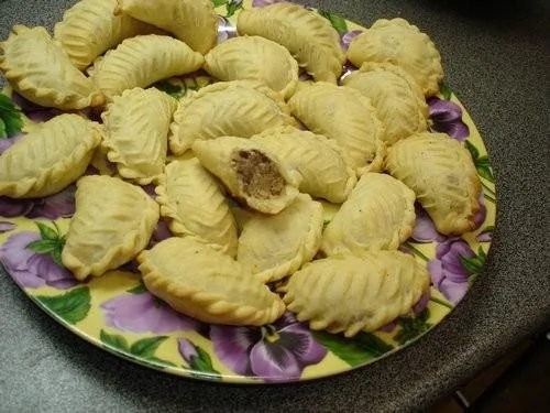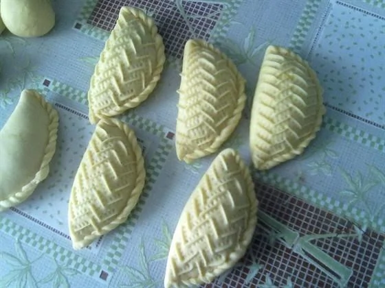 ШАГ 4 Поднявшееся тесто разделите на маленькие шарики и раскатайте каждый диаметром 12–15 см. На каждый выкладывайте по 1 столовой ложке начинки и защипывайте края в виде полумесяца.