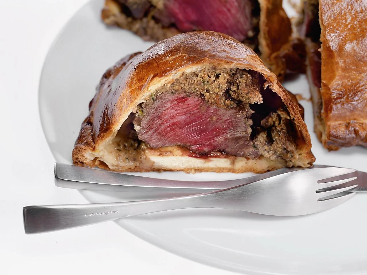 ШАГ 5 Разделить слоеное тесто надвое, раскатать обе половины. В середину первой положить песочный корж. Отрезать от мяса лишнее, чтобы кусок больше напоминал прямоугольник, положить на корж. Сверху выложить обрезки мяса и грибной фарш. Смазать тесто у краев мяса желтком, сверху накрыть вторым листом теста и прижать, выдавливая воздух, чтобы получилась плотная горка. Отрезать лишнее тесто: должны остаться края шириной примерно 2 см. Смазать их желтком, завернуть косичкой и покрыть слоем желтка рулет целиком.