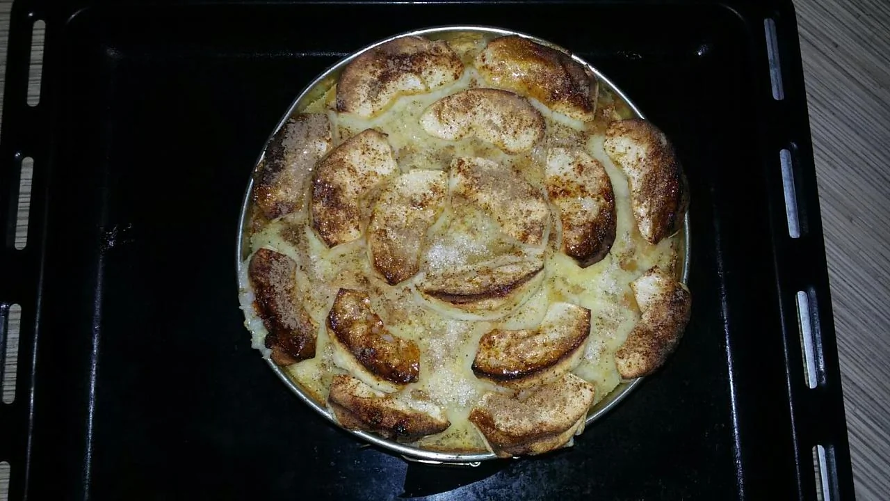 ШАГ 3 Выкладываем в силиконовую форму диаметром 20 см слой размоченного батона, слой порезанных яблок, посыпаем сахаром (1 столовая ложка), накрываем оставшимся батоном и посыпаем корицей с сахаром.