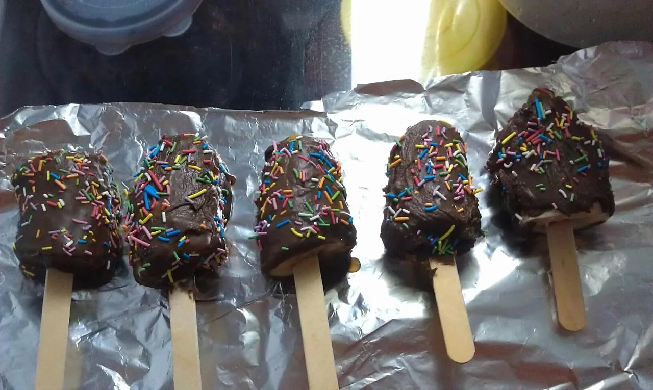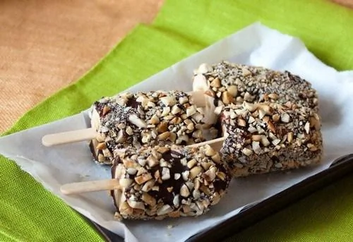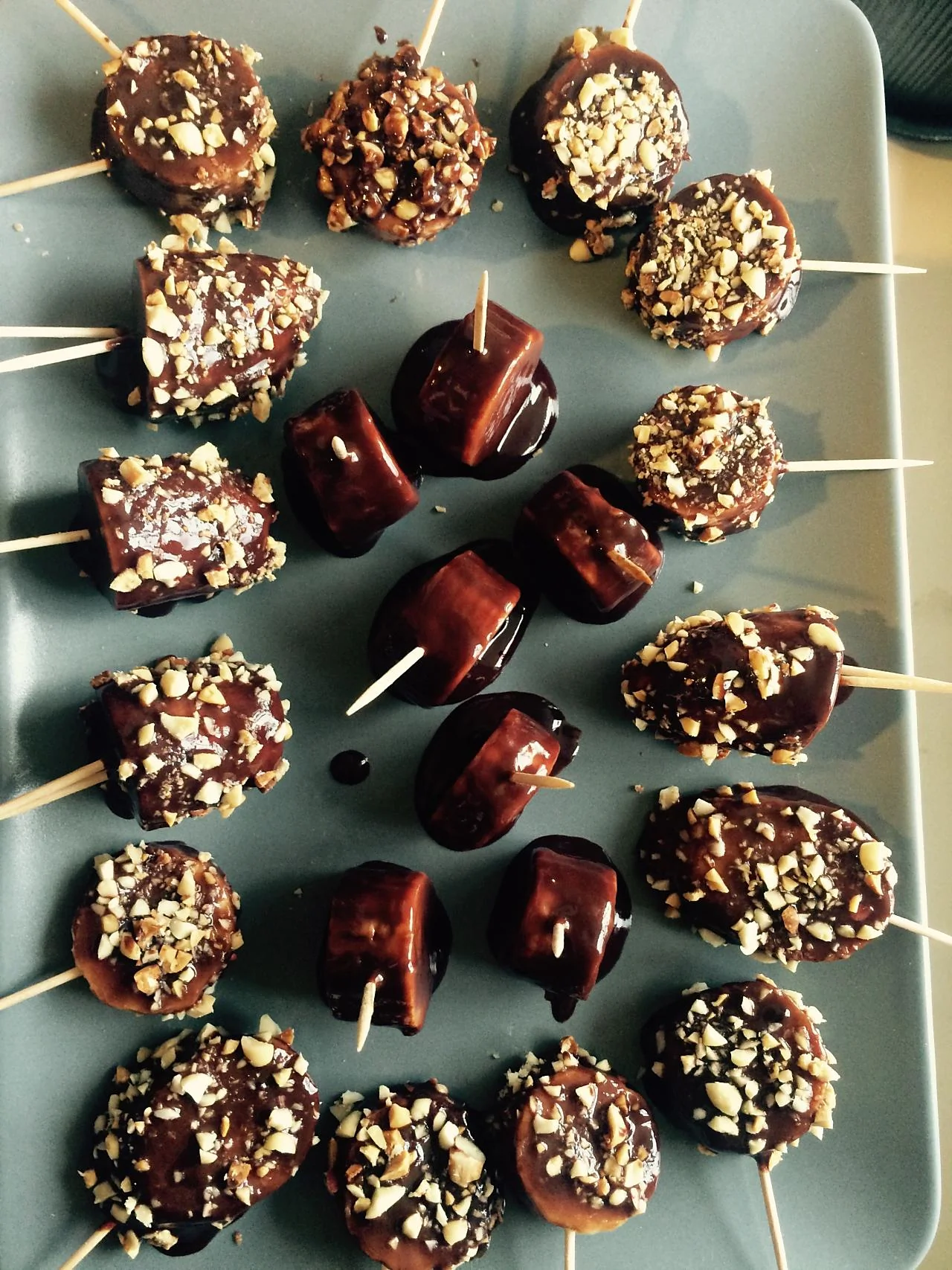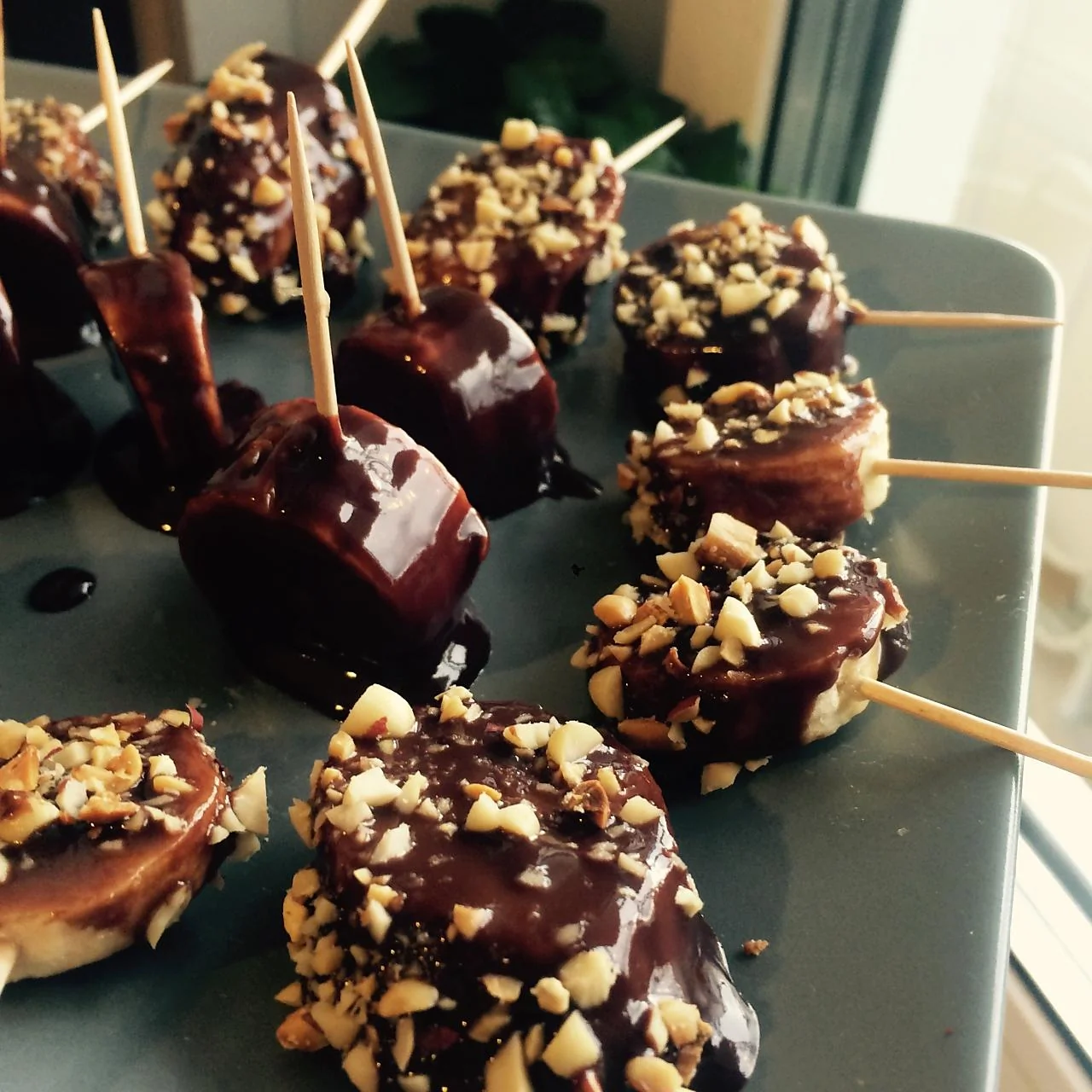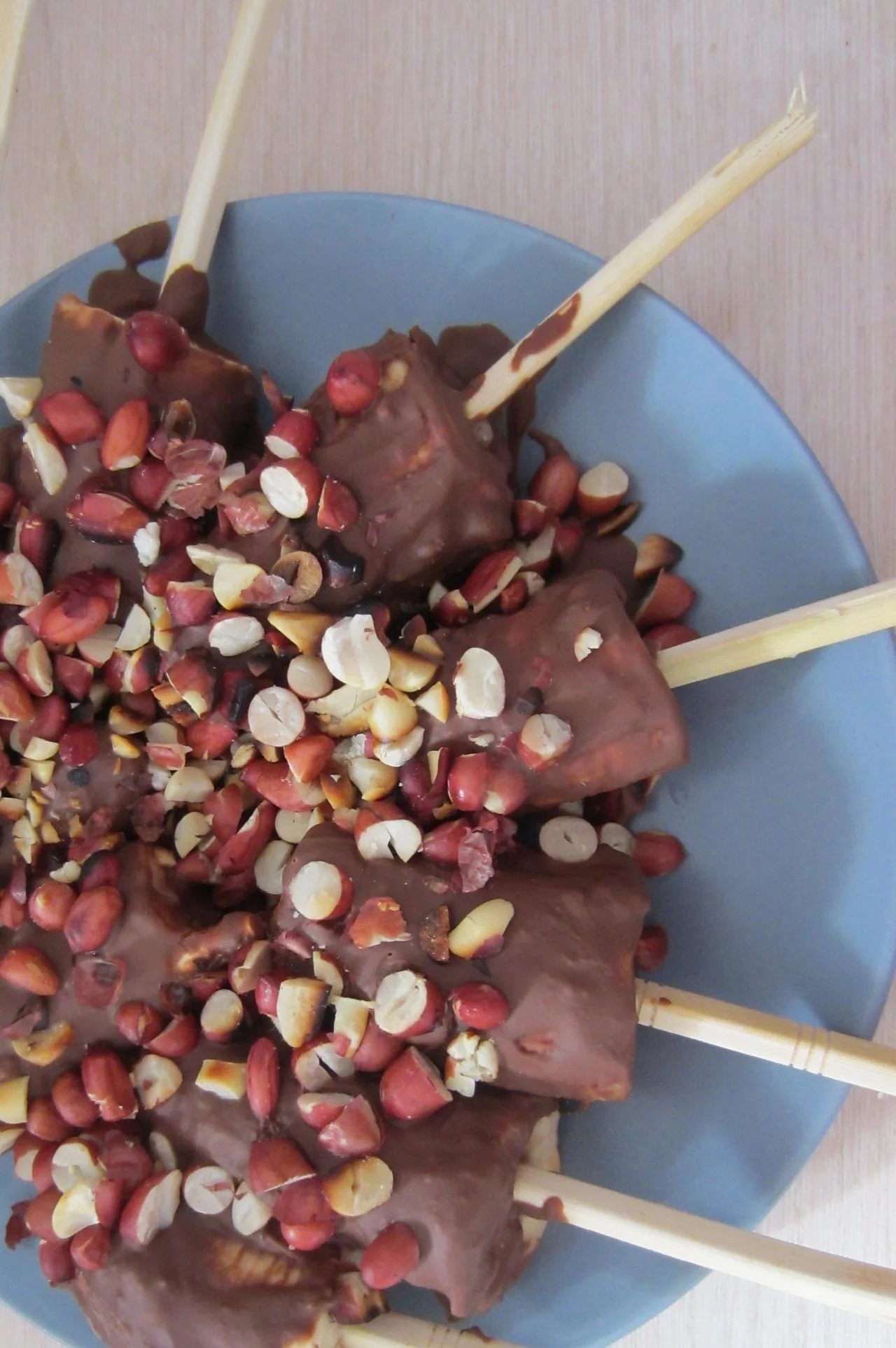 ШАГ 4 Кусочки бананов насаживаем на деревянные палочки и обмакиваем в шоколад. Затем обваливаем в орехах, кладем на пергамент и отправляем в холодильник, чтобы шоколад застыл.