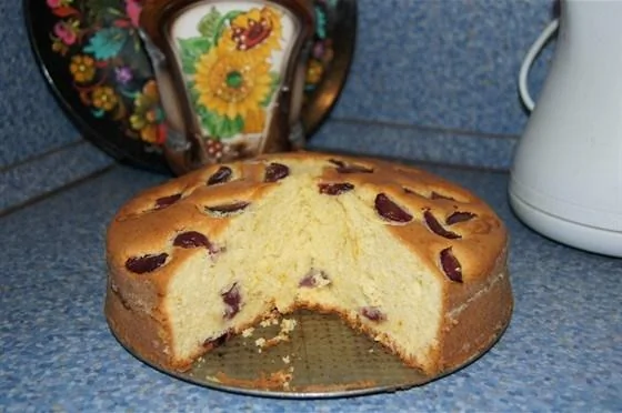 ШАГ 6 Выложить тесто в форму (диаметр не менее 28 см) и отправить в заранее разогретую до 180 градусов духовку на 10 минут. По истечении этого времени чуть выдвинуть форму с будущим пирогом и высыпать оставшийся виноград. Это в том случае, естественно, если пирог в дальнейшем не будет переворачиваться при вытаскивании из формы. Если же мы в самом начале добавили все ягоды, то продолжаем выпекать не прерываясь. Выпекать еще 45 минут.