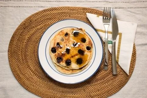 ШАГ 5 На разогретую сковороду налейте небольшое количество теста, распределите по всей поверхности и посыпьте черникой. Выпекайте до золотистого цвета, затем переверните и выпекайте до готовности. Повторите тоже самое с оставшимся тестом и ягодами.