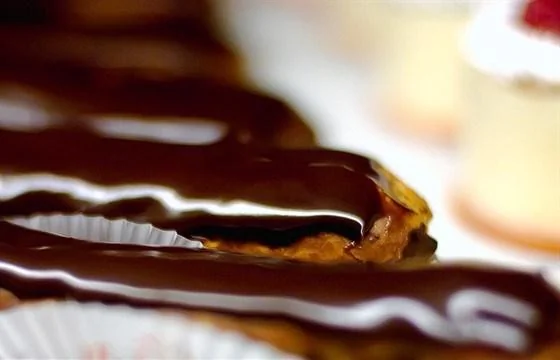 ШАГ 3 Растопите на водяной бане шоколад с добавлением сливок, 125 грамм сливочного масла и растворимого кофе. Затем охладите и на 3–4 часа поставьте в холодильник. Взбейте крем в пену, положите на нижнюю половину эклеров и накройте верхней половиной. Затем полейте эклеры глазурью из апельсинового сока с сахарной пудрой, ванильным сахаром и корицей.
