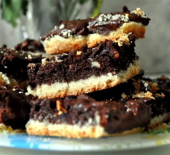 ШАГ 3 В другой емкости смешать оставшиеся 0,25 стакана муки, сгущенное молоко, какао, яйцо, кофе, ваниль и разрыхлитель. Мешать лучше ложкой. Потом добавить нарезанный орех пекан (можно заменить грецким, но у пекана более мягкий вкус) и аккуратно перемешать с тестом. Этим тестом залить приготовившийся коржик и поставить в духовку еще минут на 20.