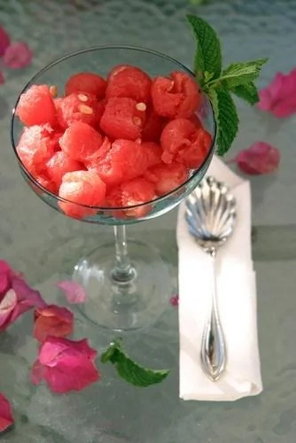ШАГ 3 Выложить арбузные шарики в миску с заправкой, посыпать мятой и аккуратно перемешать.