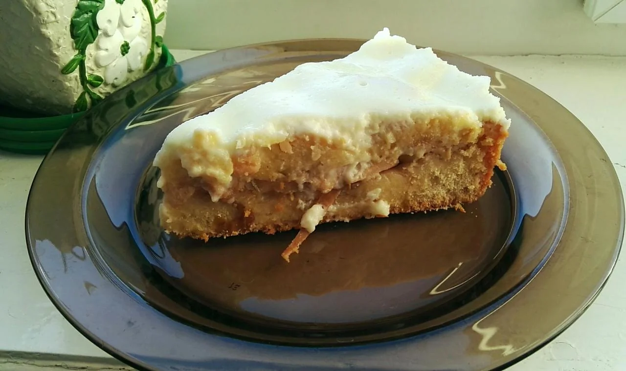ШАГ 11 Горячий пирог залить кремом. Дать остыть, затем разрезать на порции.