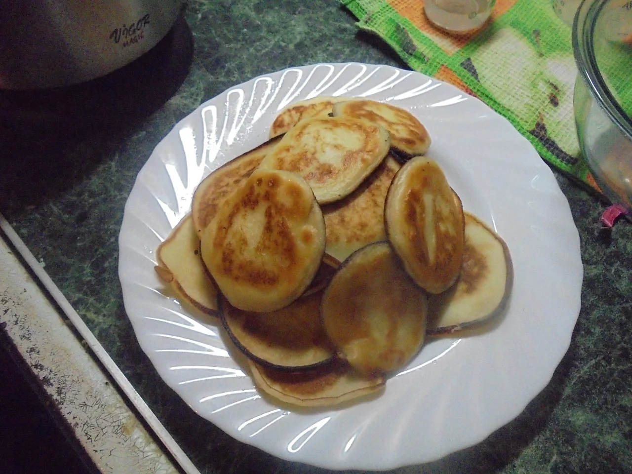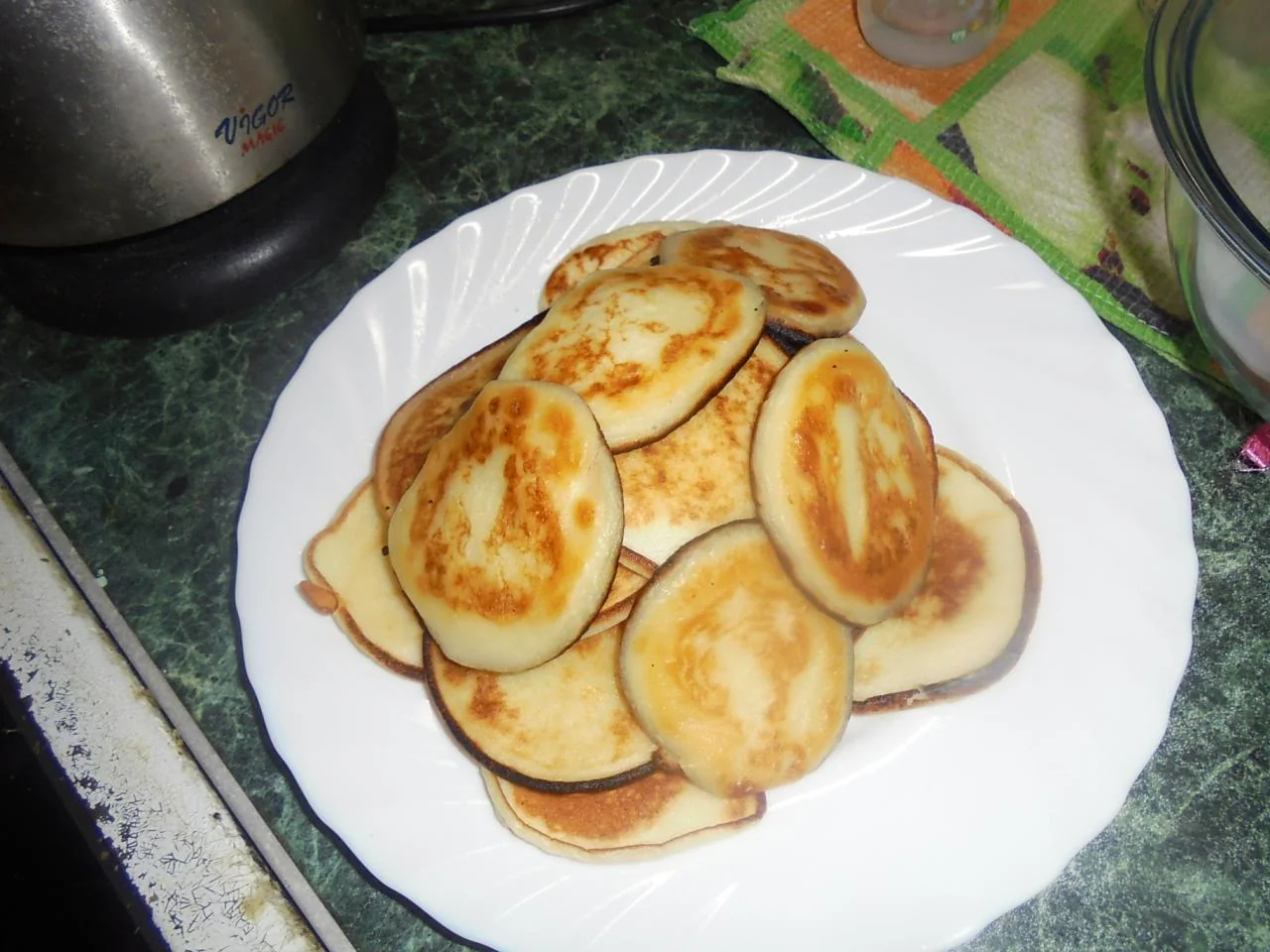 ШАГ 2 Влить молоко, примерно половину, перемешать и начать добавлять муку: немного муки — немного молока, перемешива. Затем добавить соду, взбить хорошо венчиком и жарить как обычные оладьи на хорошо разогретой сковороде в масле.