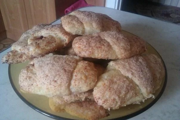 ШАГ 7 Противень застелить бумагой для выпечки. Полученный рогалик обмакнуть в оставшуюся смесь сахара с корицей и положить на противень сахаром вверх.
