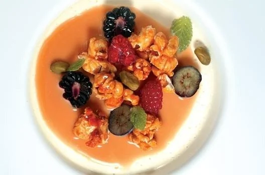 ШАГ 6 Панна-котту приправить соусом, подавать со сладким попкорном и ягодами.