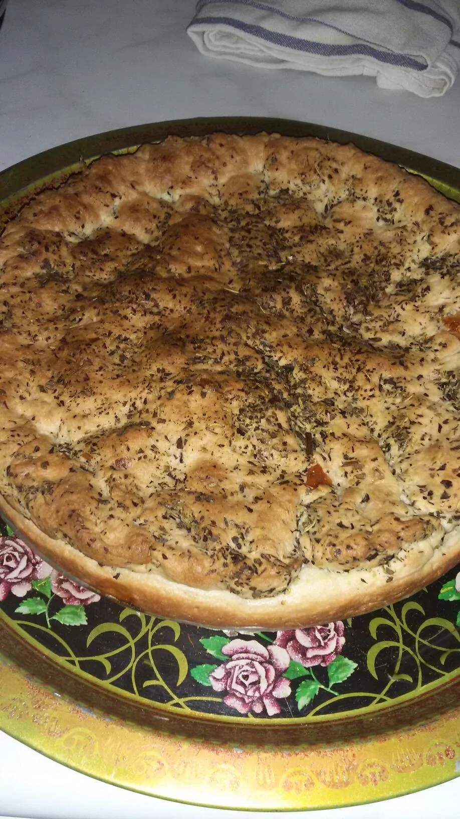 ШАГ 3 Достать тесто. Отделить от него 2/3 и раскатать до размера, необходимого для того, чтобы застелить дно и бортики формы. Поместить тесто в форму, расправить и наколоть вилкой в нескольких местах. Выложить начинку, немного прижать ее. Затем нужно раскатать оставшуюся 1/3 теста — оно будет служить верхним слоем. Посыпать пласт французскими травами (базилик, розмарин, тимьян) и вкатать их в тесто скалкой.
