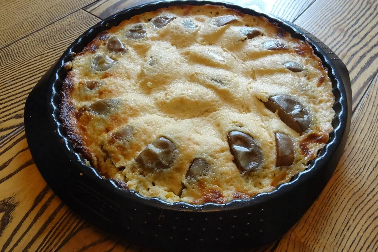 Достать из духовки форму с грушами, залить груши сырно-сливочной массой и поставить в духовку еще на двадцать минут.
