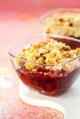 ШАГ 4 Смажьте маслом 4 порционные огнеупорные формы (по 9 см в диаметре) и разложите в них ежевику. Поставьте формы на противень и посыпьте приготовленной крошкой.