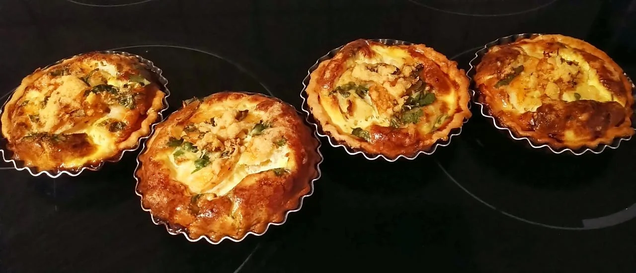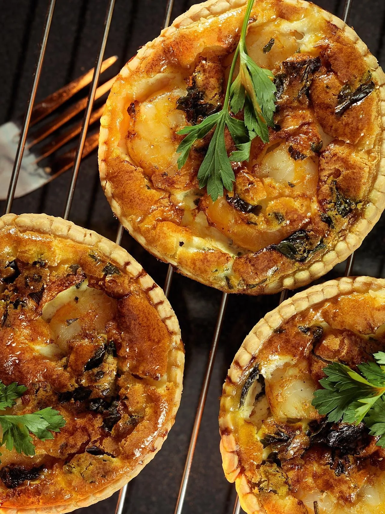 ШАГ 3 Очистить креветки. Перемешать их с петрушкой и чесноком. Выложить в коржи нарезанный небольшими кубиками эмменталь. Сверху равномерно уложить креветочную смесь (на каждый киш должно прийтись по три креветки) — и залить соусом, давая ему время пропитывать начинку.