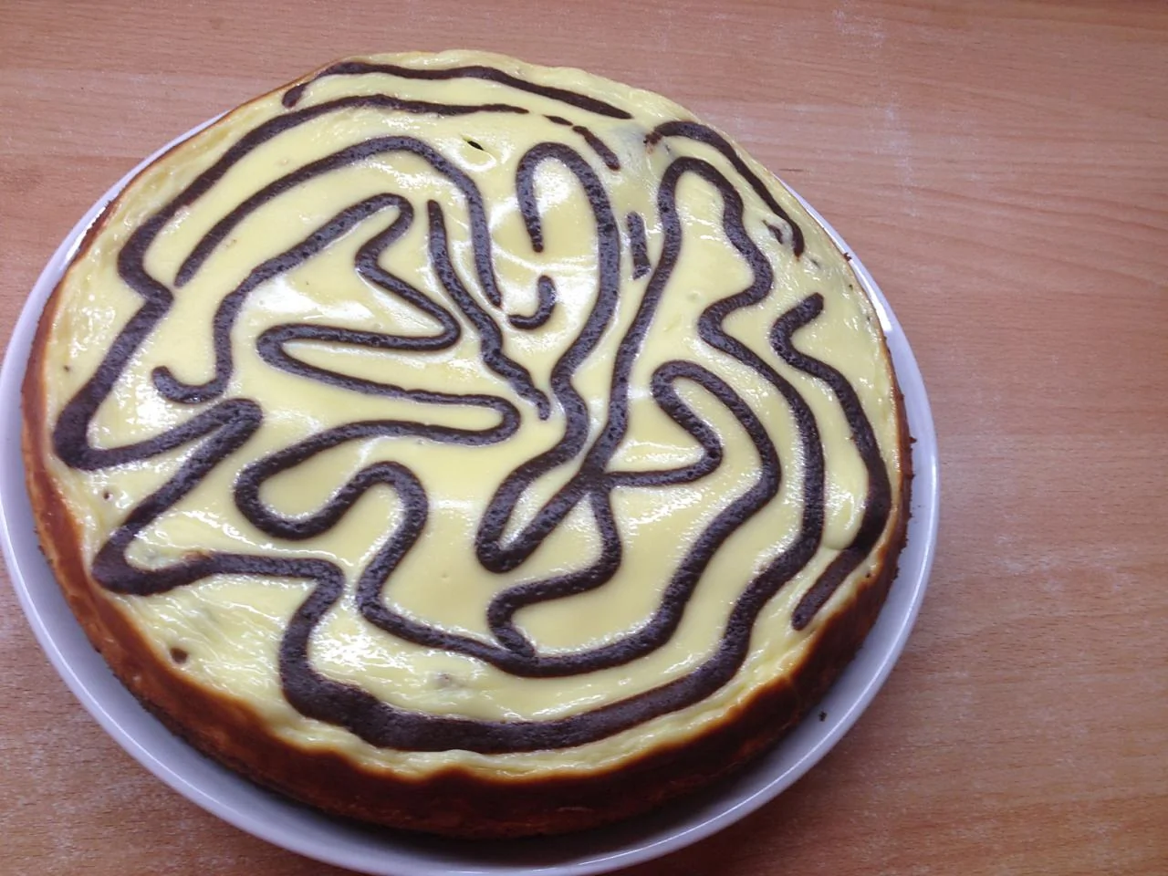 ШАГ 8 Сверху выложить оставшееся шоколадное тесто. Поводить вилкой для образования мраморного узора.
