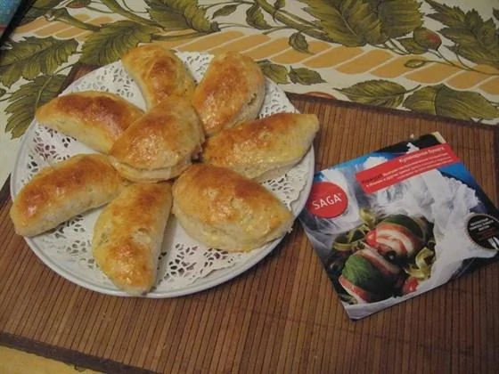 ШАГ 5 Раскатывать тесто толщиной в 0,5 см. Вырезать круги диаметром см по 12. На одну половину выложить немного яблочной начинки, смазать края желтком, взбитым со сливками, сложить пирожок пополам, прижимая края.