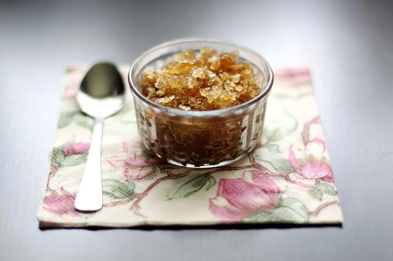 ШАГ 1 В миске смешайте горячий кофе и сахар. Вылейте в контейнер и охладите до комнатной температуры. Затем заморозьте, перемешивая каждые 30 минут, примерно 3 часа.