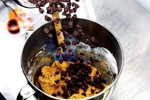 ШАГ 4 Всыпать полученную смесь в маслянную массу. Вымесить тесто и добавить в него шоколадную крошку.