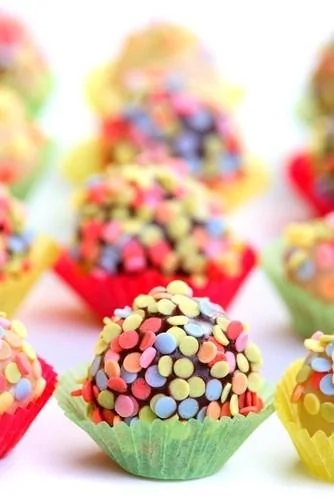 ШАГ 6 Обмакните половину трюфелей в темный шоколад, а половину — в белый. Выложите на бумагу для выпечки, сверху посыпье украшениями и оставьте застыть на некоторое время.