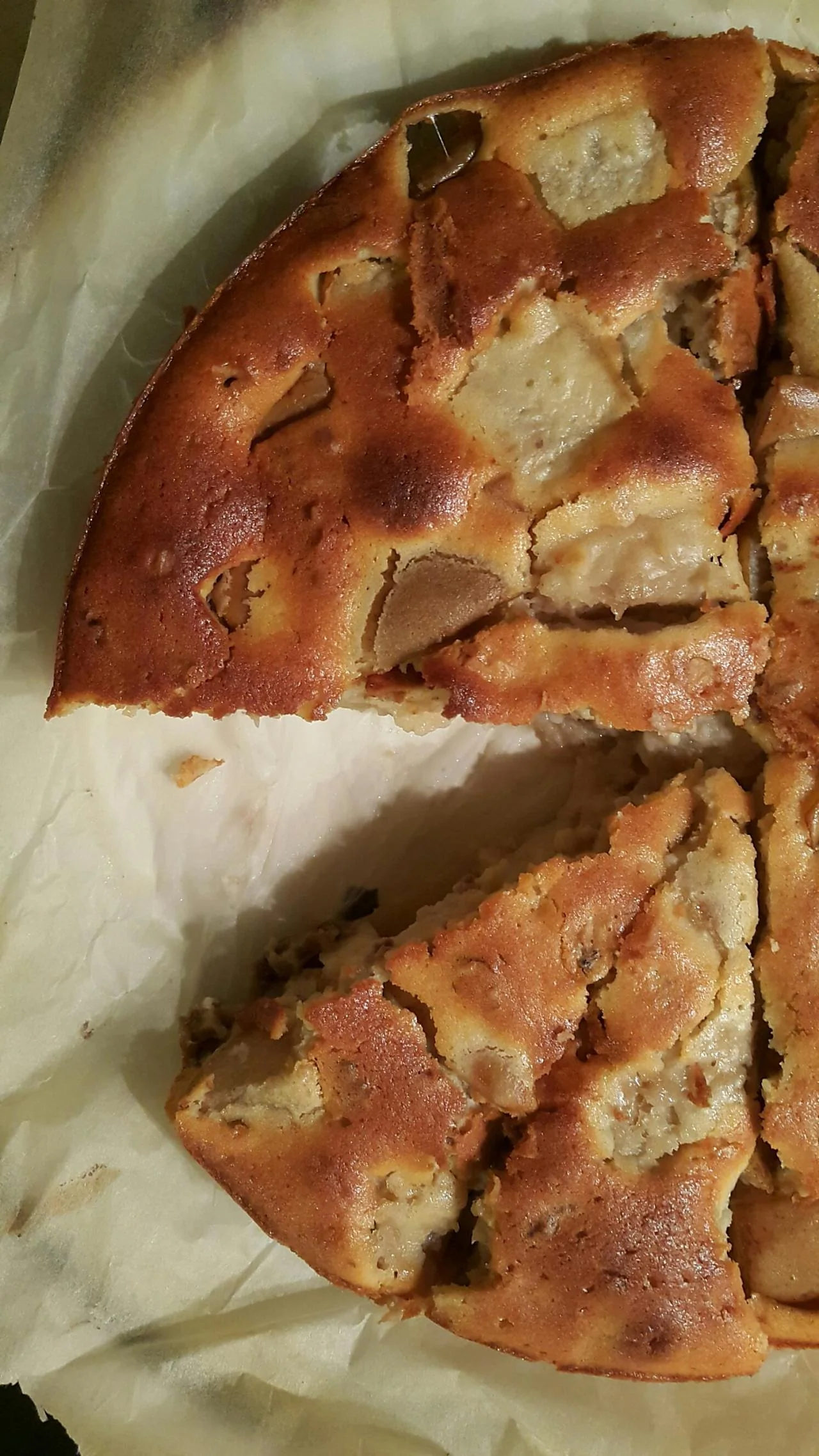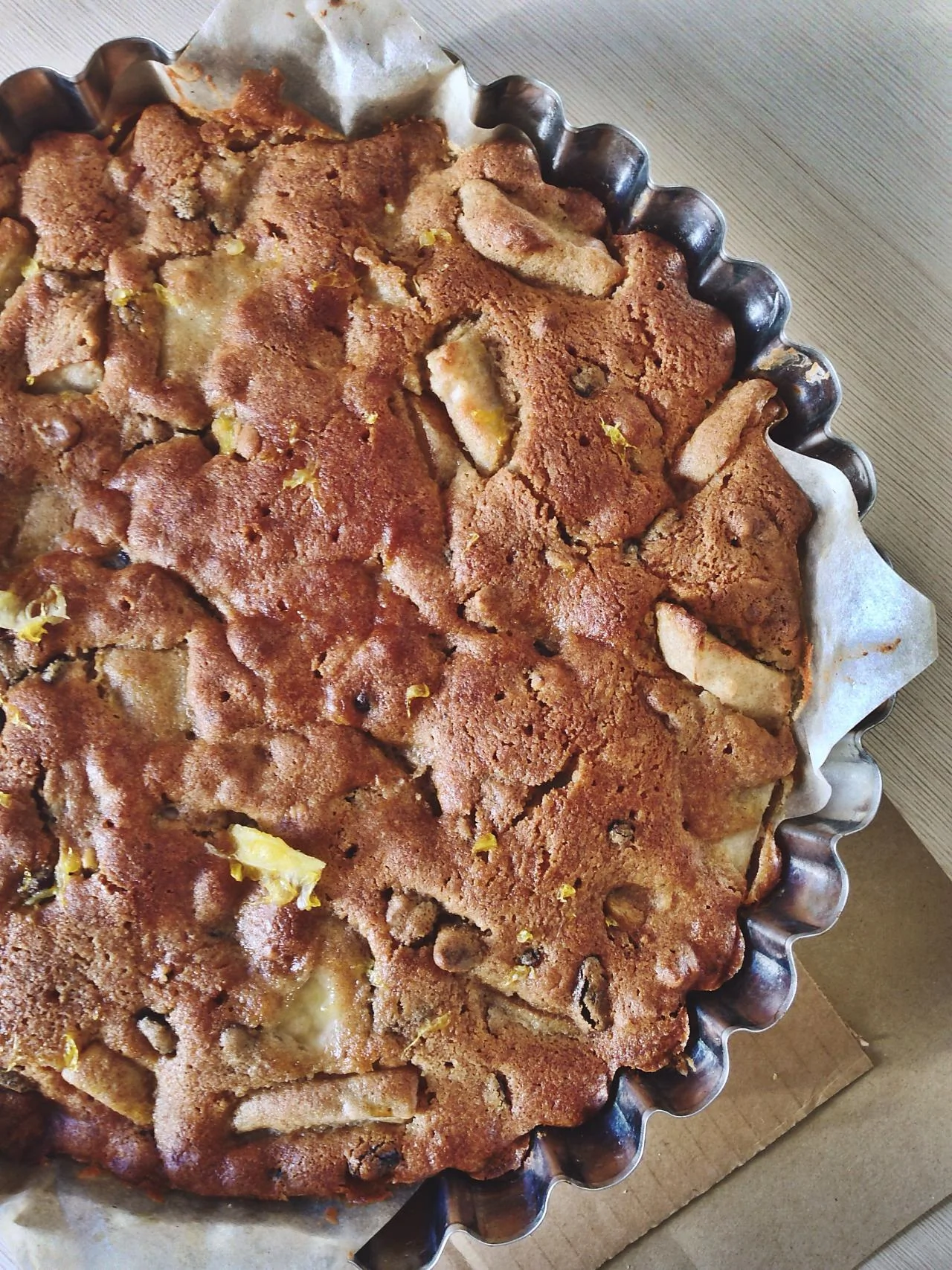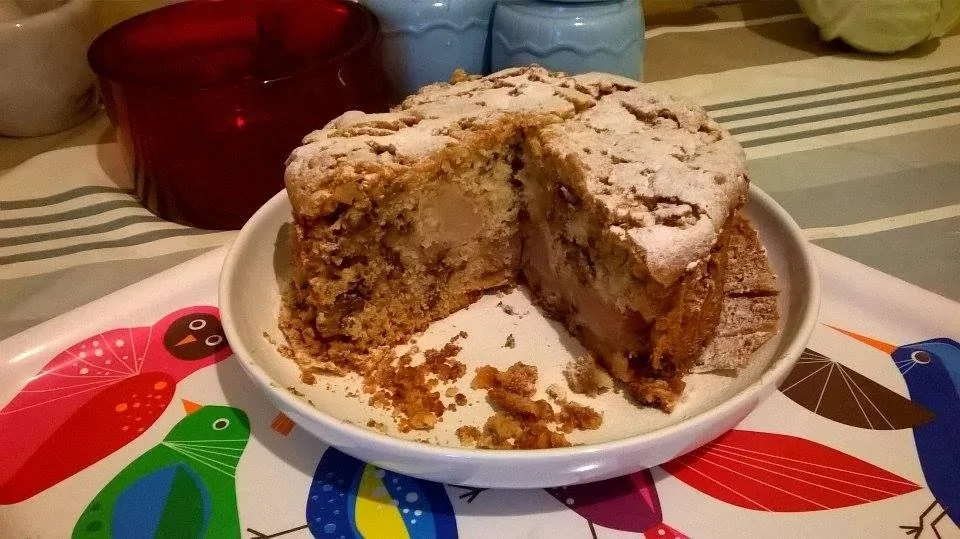ШАГ 3 Добавить очищенные и крупно нарезанные груши, орехи и изюм в тесто и аккуратно перемешать. Выложить в подготовленную форму и разровнять поверхность. С помощью ложки сформировать небольшое углубление в центре пирога. Поставить в духовку на 50–60 минут, проверяя на готовность спичкой.