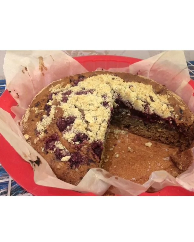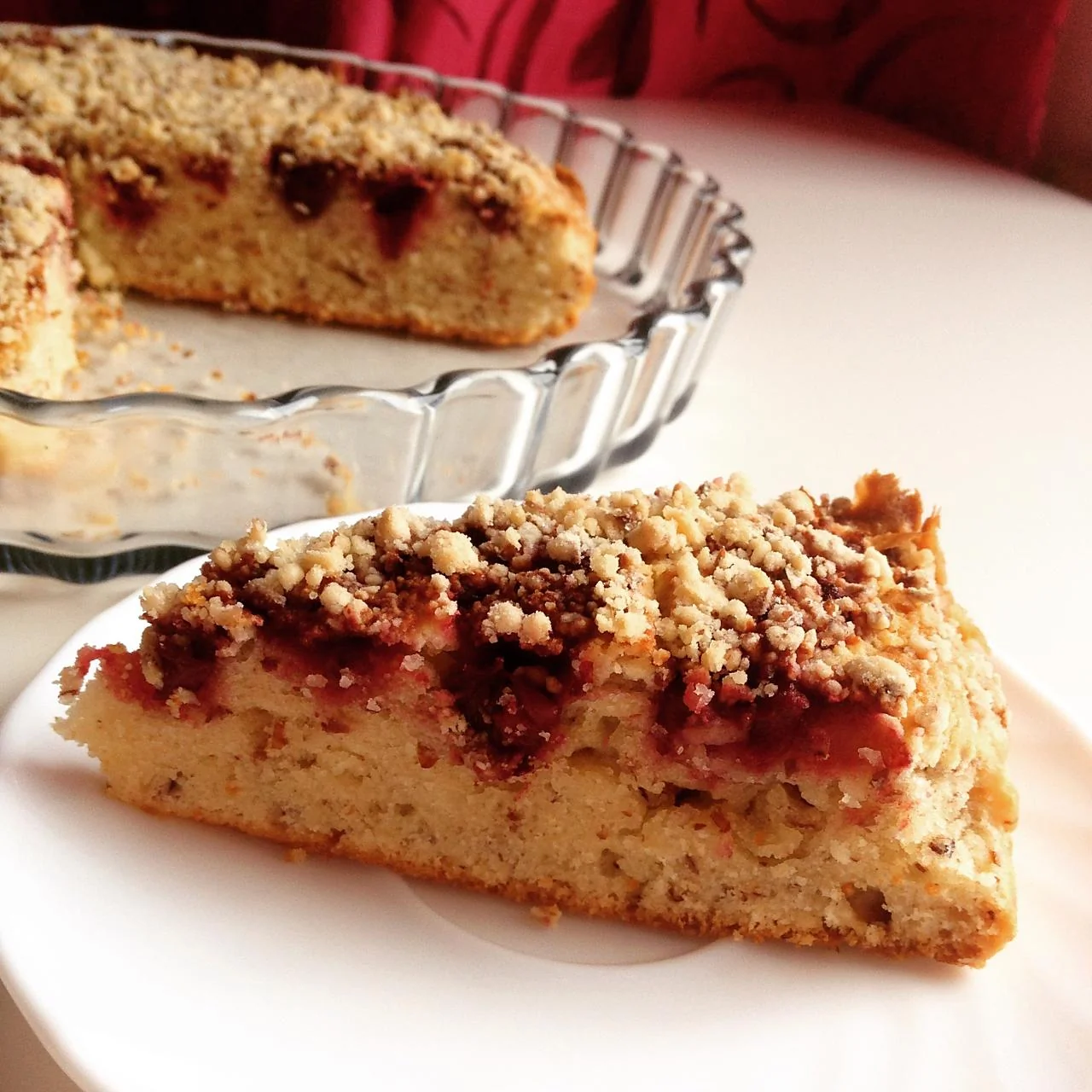 ШАГ 3 Смешать в миске миндаль, 1 столовую ложку сахара, 1 столовую ложку размягченного сливочного масла и 2–3 столовые ложки муки, перетереть в крошку, посыпать сверху пирог.