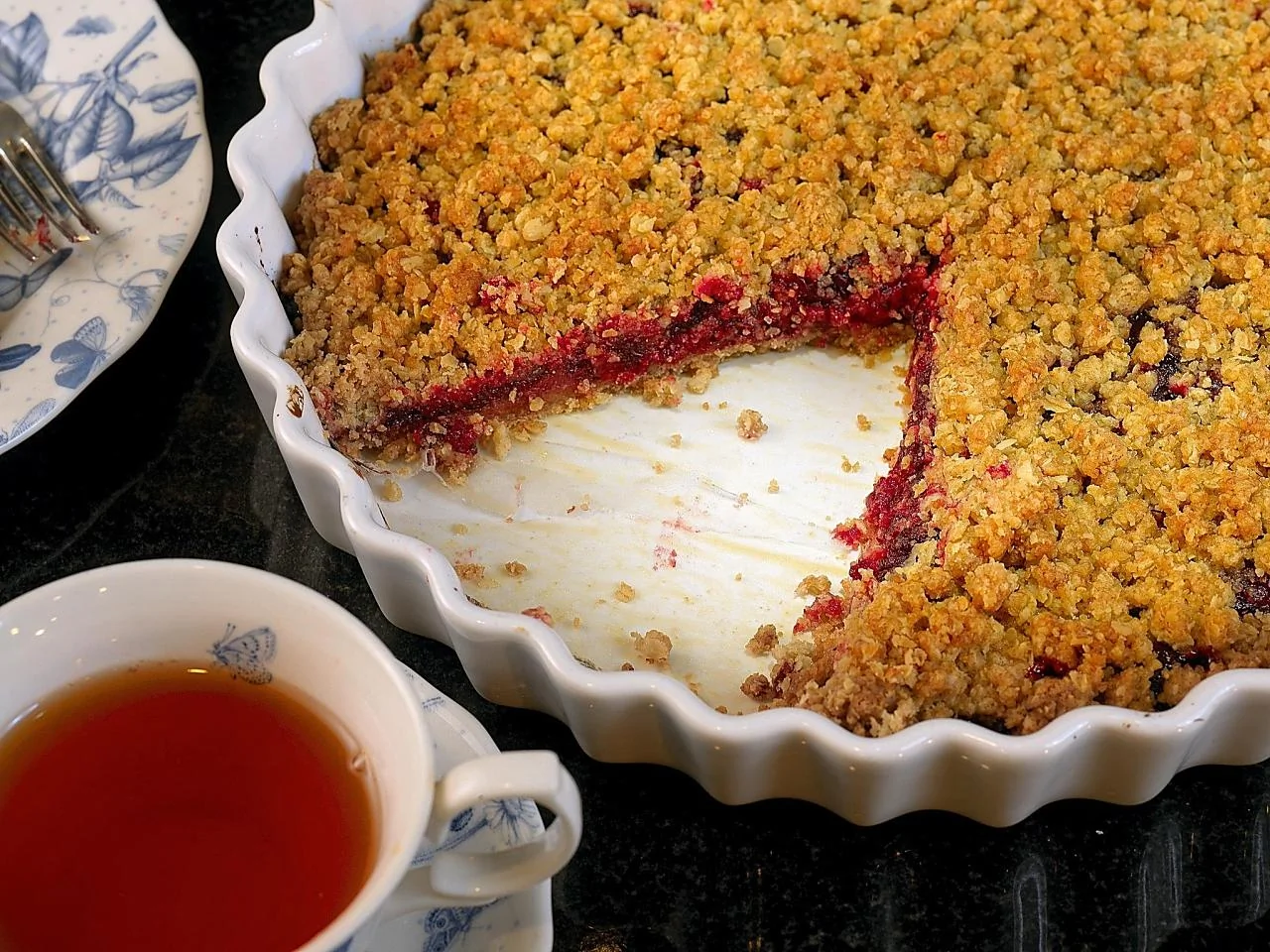 ШАГ 4 Разделить тесто пополам. Одну половину выложить в круглую форму диаметром 28 см и равномерно распределить по ее дну и стенкам. Выложить в форму клюквенную начинку, посыпать оставшимися крошками и немного придавить.
