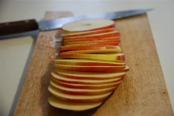 ШАГ 1 Помыть, высушить яблоки. Тонко нарезать.