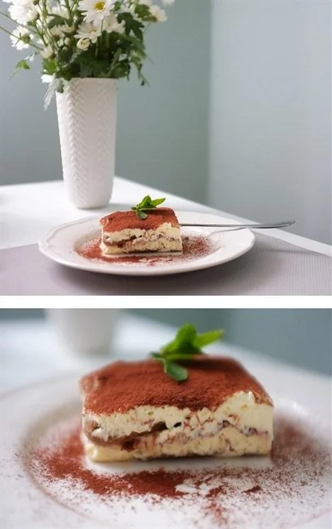 ШАГ 8 Выложить половину крема на первый слой савоярди, уже залитый кофе. Распределить по форме и посыпать какао-порошком.